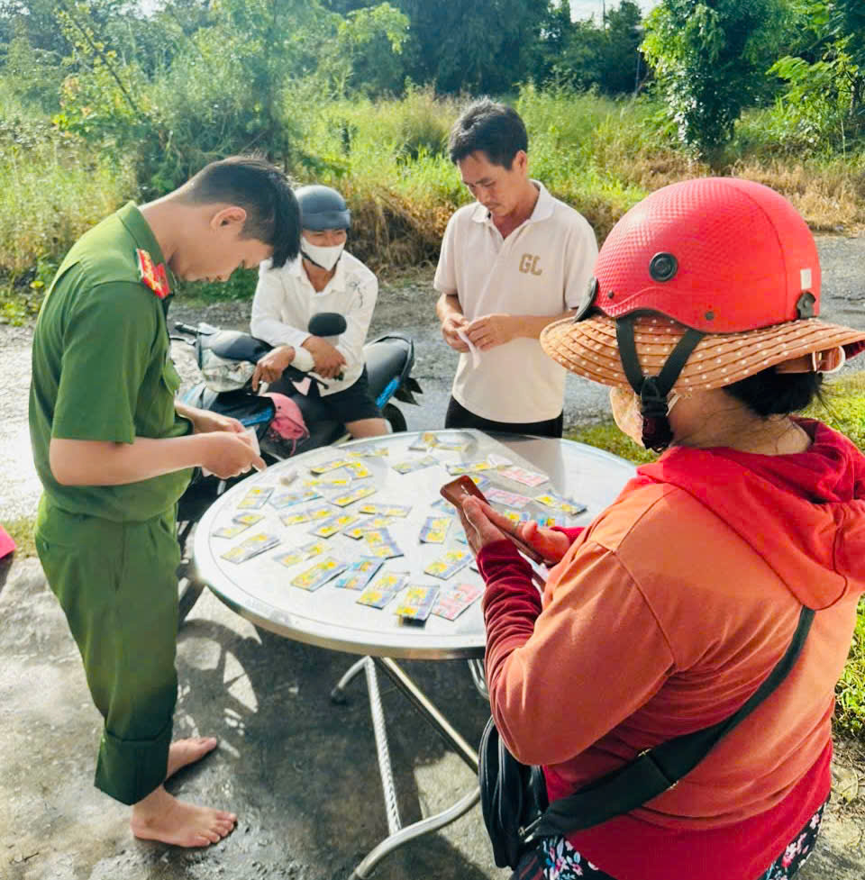 CBCS Công an xã cùng người dân giúp chị phơi khô vé số