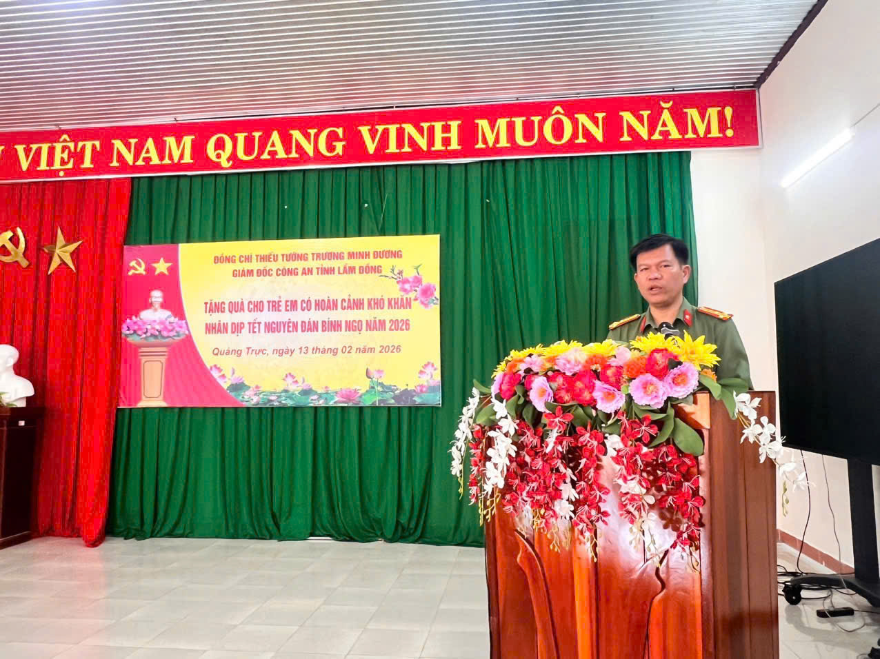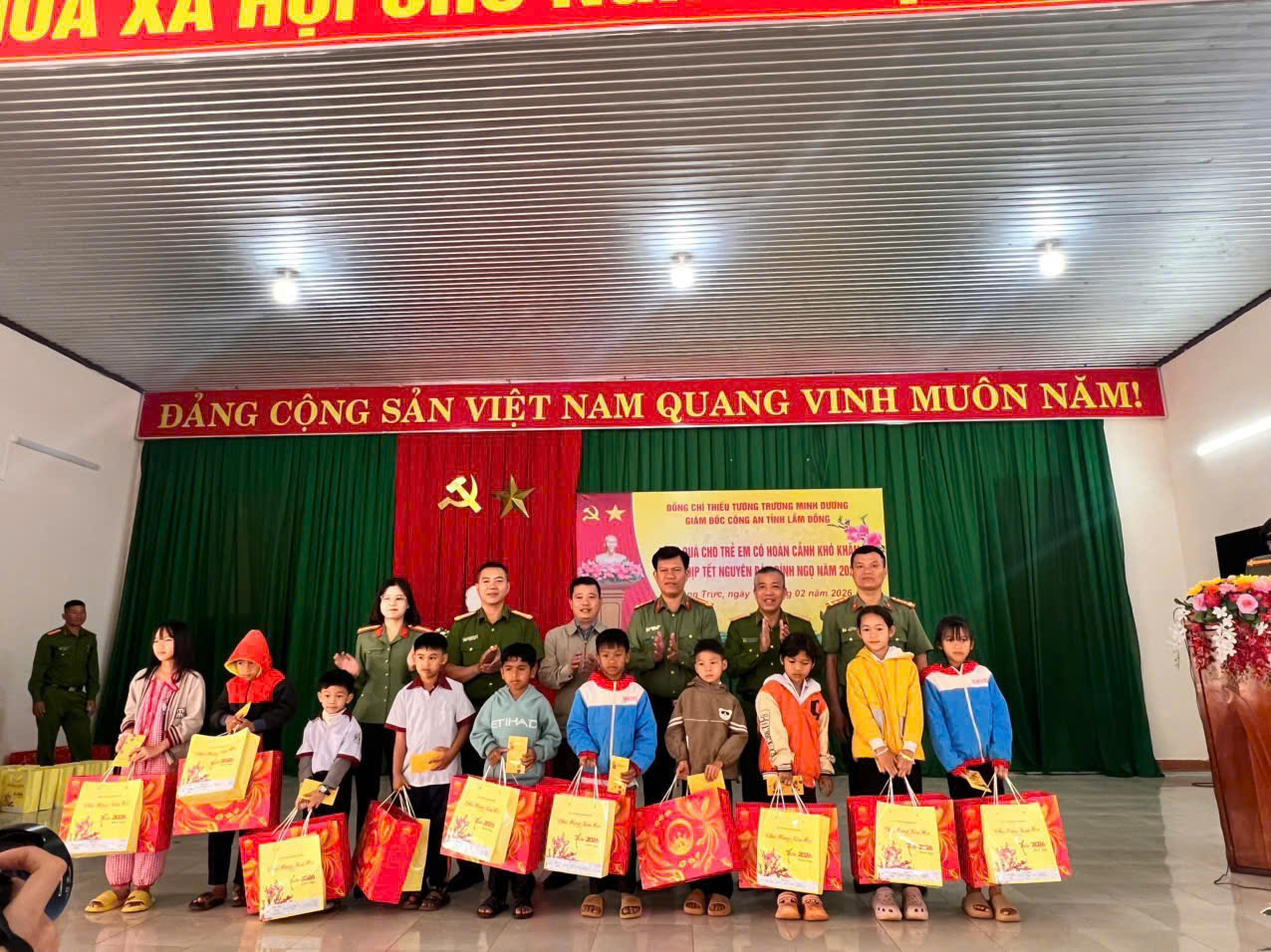 Trong 2 ngày 12 và 13/2, Đoàn công tác của Công an tỉnh Lâm Đồng thừa ủy quyền của Thiếu tướng Trương Minh Đương, Giám đốc Công an tỉnh Lâm Đồng đã trao 100 phần quà gồm bánh kẹo, nhu yếu phẩm Tết và phong bao lì xì được chuẩn bị chu đáo, gửi gắm thông điệp yêu thương và hy vọng đến các em học sinh có hoàn cảnh khó khăn tại 2 xã Sơn Điền và Quảng Trực (Lâm Đồng).