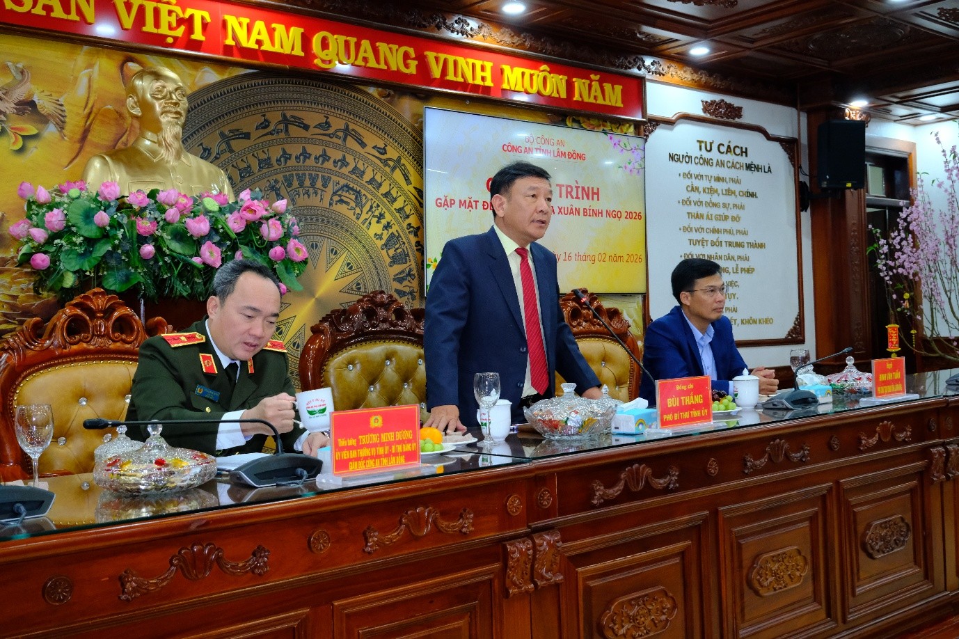 Phát biểu tại buổi giao ban, đồng chí Bùi Thắng, Phó Bí thư Tỉnh ủy ghi nhận, biểu dương những kết quả mà Công an tỉnh Lâm Đồng đã đạt được trong công tác bảo đảm an ninh, trật tự, nhất là trong thời gian cao điểm trước Tết Nguyên đán Bính Ngọ 2026. Đồng thời chia sẻ sâu sắc với những hi sinh thầm lặng của các cán bộ, chiến sĩ khi phải gác lại niềm vui sum họp bên gia đình trong thời khắc thiêng liêng nhất của năm mới để bám trụ tại các chốt trực. Đồng chí Phó Bí thư tỉnh ủy tin tưởng trong thời gian tới toàn thể cán bộ, chiến sỹ Công an tỉnh sẽ cố gắng hơn nữa nhằm giữ vững an ninh trật tự của tỉnh nhà. Nhân dịp Tết đến xuân về, đồng chí Bùi Thắng, Phó Bí thư Tỉnh ủy đã gửi lời chúc mừng năm mới tới toàn thể cán bộ, chiến sĩ Công an tỉnh và gia đình đón một mùa xuân mới vui tươi, đầm ấm và an toàn.