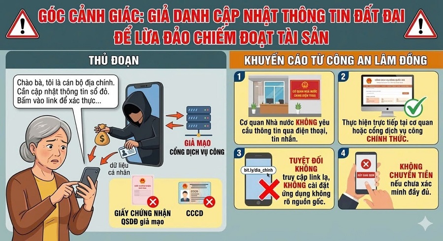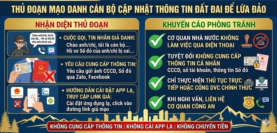 Các đối tượng thường gọi điện hoặc nhắn tin yêu cầu người dân “cập nhật”, “chỉnh lý thông tin giấy chứng nhận quyền sử dụng đất” với lý do phục vụ số hóa dữ liệu. Sau đó, chúng yêu cầu cung cấp hình ảnh giấy chứng nhận quyền sử dụng đất, căn cước công dân, thông tin tài khoản ngân hàng hoặc hướng dẫn truy cập các đường link giả mạo cổng dịch vụ công, cài đặt ứng dụng để “xác thực thông tin”. Khi người dân làm theo, các đối tượng sẽ chiếm đoạt thông tin cá nhân và thực hiện hành vi lừa đảo chiếm đoạt tài sản hoặc sử dụng dữ liệu vào mục đích trái pháp luật.