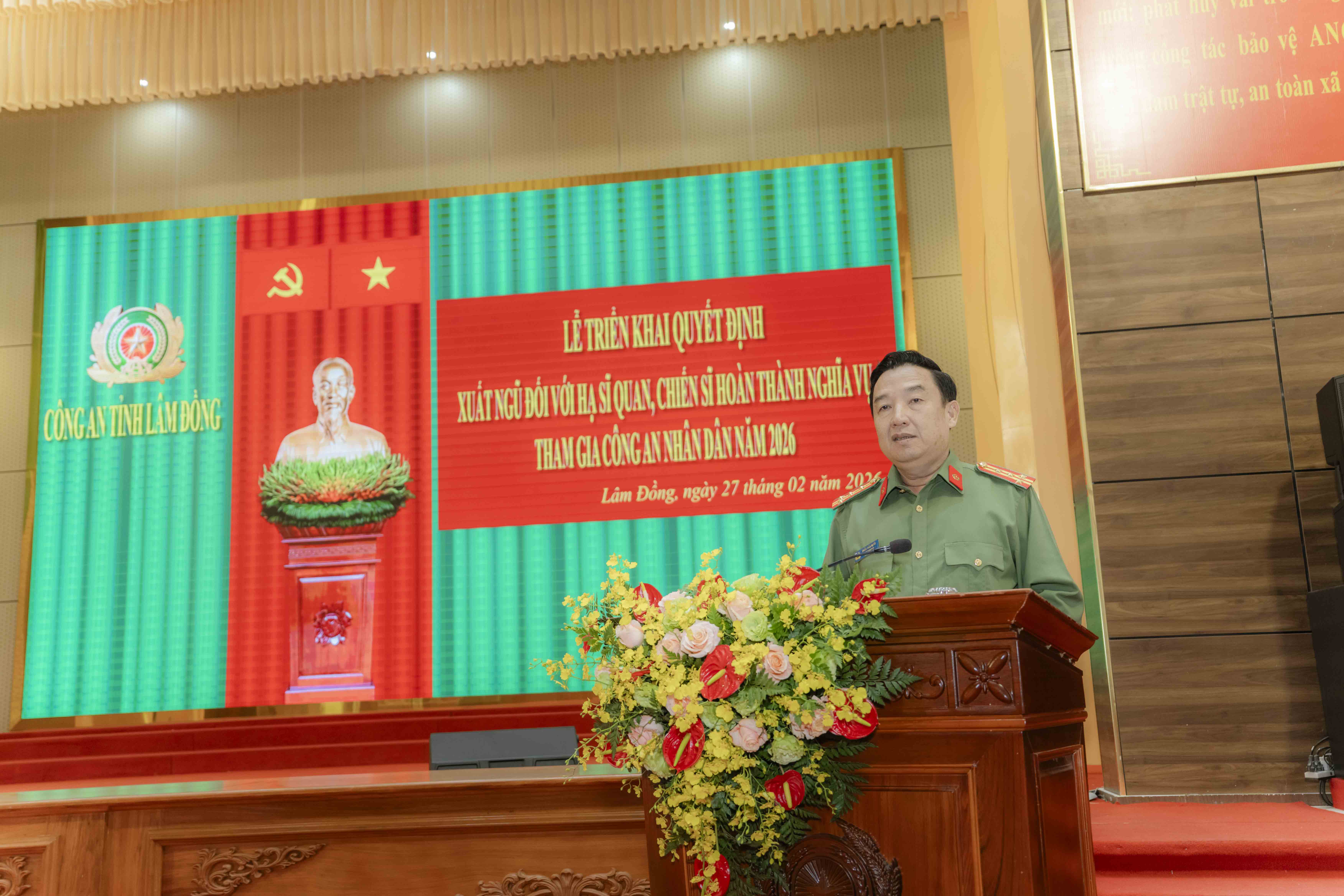 "Ngày xưa tôi cũng như các đồng chí, cũng quần áo lấm lem, cũng bỡ ngỡ... Hai năm rèn luyện ở đây không chỉ là thực hiện nghĩa vụ thiêng liêng với Tổ quốc mà là một trường đại học lớn để thử thách ý chí. Dù hoàn cảnh có khó khăn đến đâu, dù sau này các đồng chí bước ra ngoài xã hội làm công việc gì thì bản lĩnh và ý thức kỷ luật được tôi rèn trong lực lượng Công an sẽ là hành trang quý giá nhất."