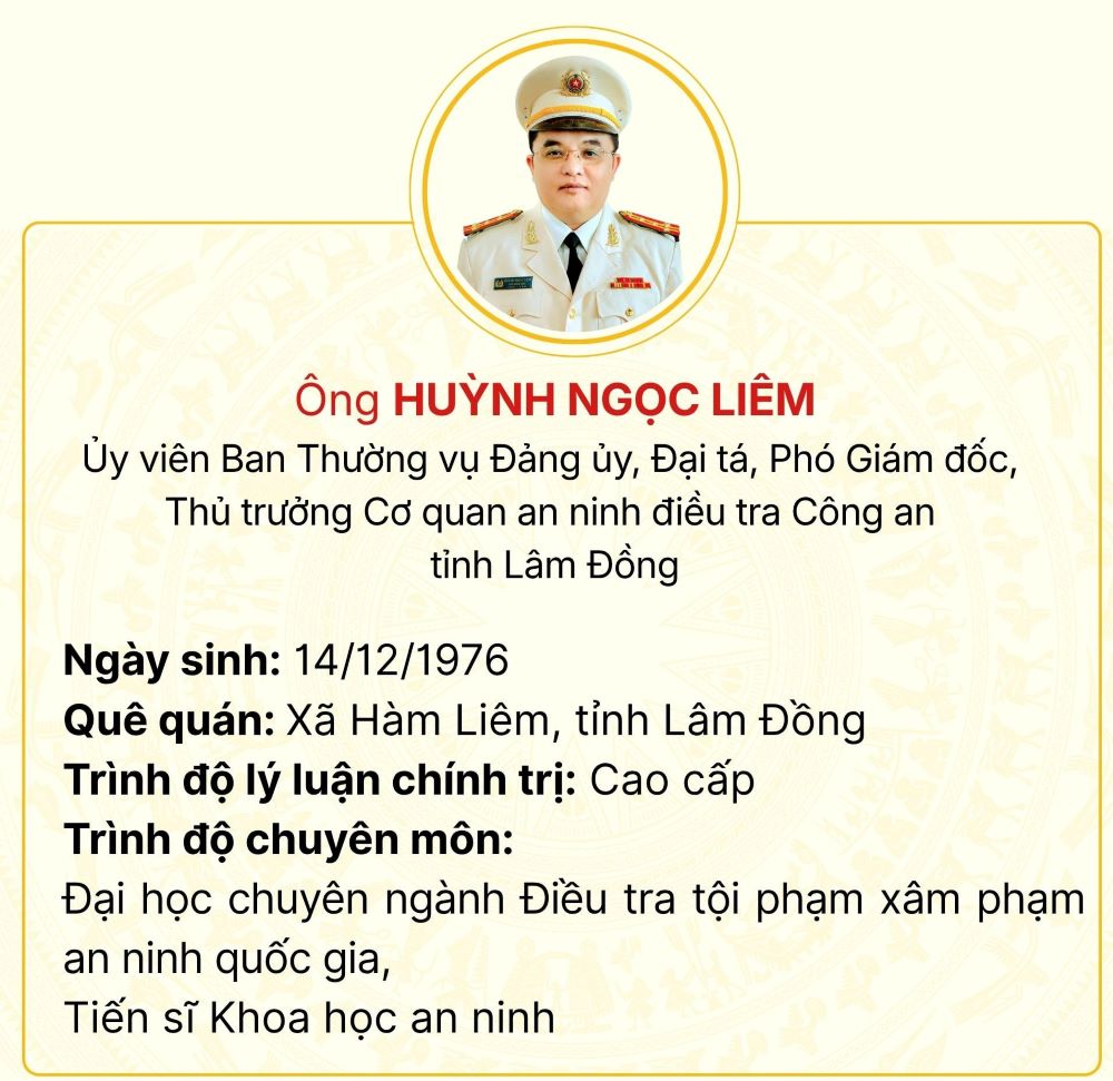 Chiều 21/3, Hội đồng Bầu cử quốc gia tổ chức họp báo công bố danh sách những người trúng cử Đại biểu Quốc hội khóa XVI. Theo nghị quyết của Hội đồng Bầu cử quốc gia quyết nghị công bố kết quả bầu cử và danh sách 500 người trúng cử Đại biểu Quốc hội khóa XVI, có 17 người trúng cử Đại biểu Quốc hội khóa XVI tại Lâm Đồng. Đại tá Huỳnh Ngọc Liêm, Phó Giám đốc Công an tỉnh Lâm Đồng trúng cử Đại biểu Quốc hội nhiệm kỳ 2026-2031 Thực hiện: Như Ý Danh sách 17 người trúng cử Đại biểu Quốc hội khóa XVI tại Lâm Đồng.pdf
