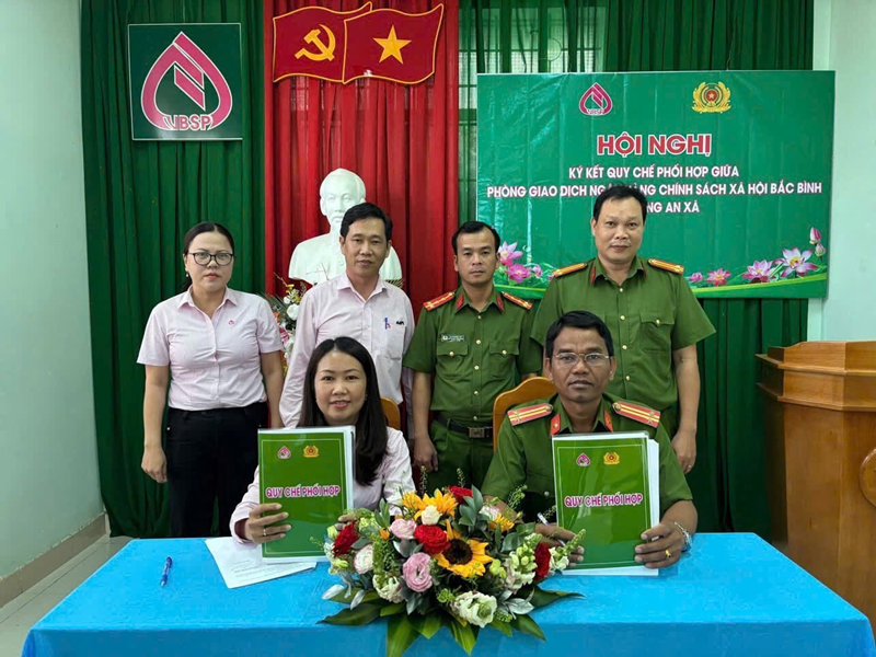 Đại diện Phòng giao dịch Ngân hàng Chính sách xã hội Bắc Bình và Công an xã Hồng Thái ký kết quy chế phối hợp