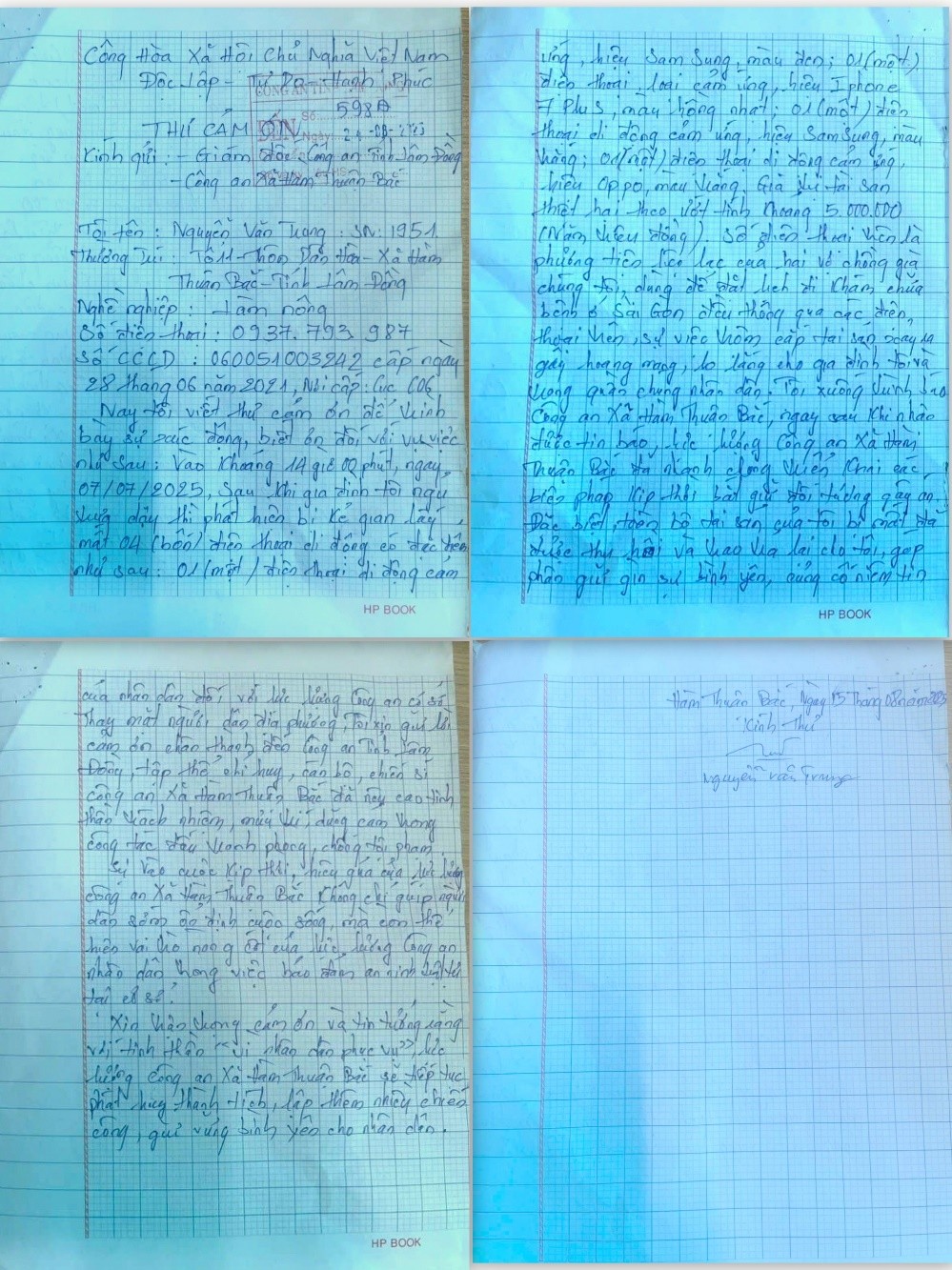 Sau khi nhận lại tài sản bị mất, ông Nguyễn Văn Trung đã gửi thư cảm ơn đến Ban Giám đốc Công an tỉnh Lâm Đồng và Công an xã Hàm Thuận Bắc. Trong thư, ông bày tỏ sự xúc động trước tinh thần trách nhiệm, sự vào cuộc kịp thời và hiệu quả của lực lượng Công an địa phương.