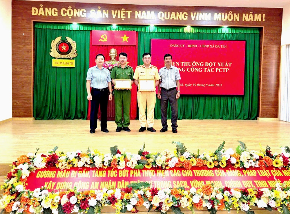 Đồng chí Tống Giang Nam - Bí thư Đảng ủy, Chủ tịch HĐND xã và đồng chí Nguyễn Hoàng Minh, Phó Bí thư Đảng ủy, Chủ tịch UBND xã động viên,, khen thưởng đột xuất cho các tập thể, cá nhân đạt thành tích xuất sắc trong công tác PCTP