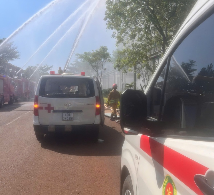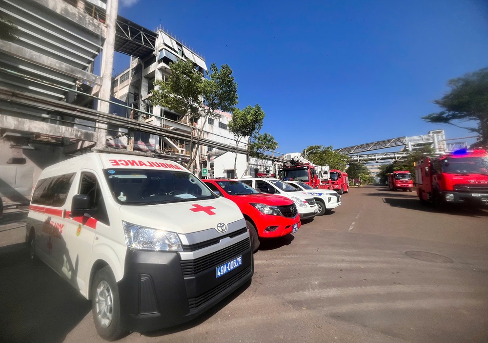 Trong tình huống giả định xảy ra cháy, có nhiều nạn nhân bị thương, CBCS Đội xe được giao nhiệm vụ điều khiển xe cứu thương, phối hợp với lực lượng y tế tổ chức sơ cấp cứu ban đầu và nhanh chóng vận chuyển nạn nhân đến cơ sở y tế.
