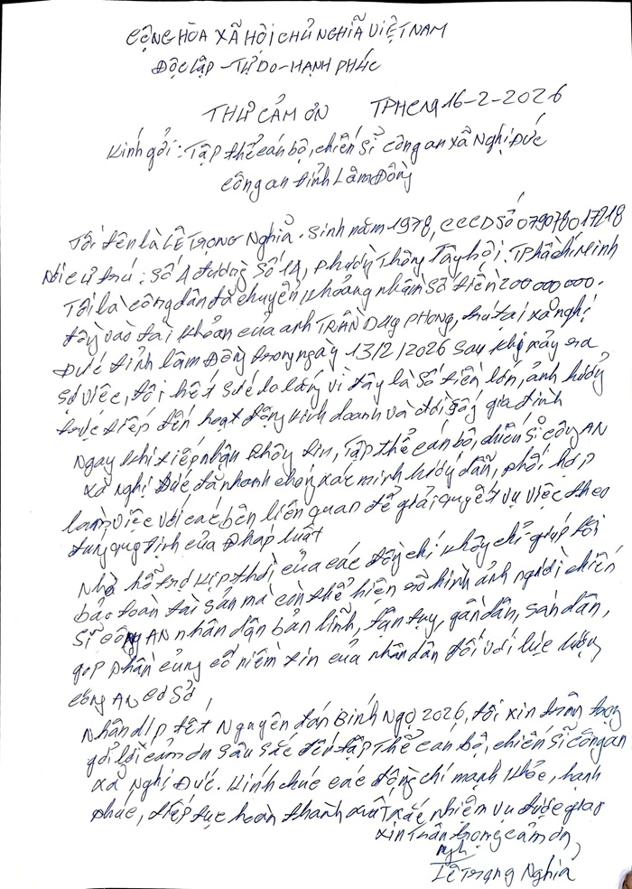 Ngay trong chiều 16/02/2026, dưới sự chứng kiến của lực lượng Công an xã, anh Trần Duy Phong đã trao trả số tiền nhận nhầm cho anh Lê Trọng Nghĩa. Việc giao, nhận tiền được thực hiện an toàn, minh bạch, đúng pháp luật. Nhận được tiền, anh Nghĩa bày tỏ sự xúc động và gửi lời cảm ơn sâu sắc đến tập thể cán bộ, chiến sĩ Công an xã Nghị Đức vì sự tận tâm, gần dân, hết lòng vì Nhân dân phục vụ.