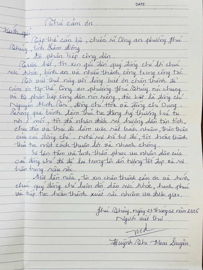 Trong thư, chị bày tỏ sự trân trọng đối với tinh thần trách nhiệm, thái độ niềm nở, hướng dẫn chu đáo của cán bộ, chiến sĩ trong quá trình giải quyết thủ tục hành chính. Những phản hồi tích cực từ người dân cho thấy sự chuyển biến rõ nét trong cải cách hành chính, nâng cao chất lượng phục vụ Nhân dân tại cơ sở.