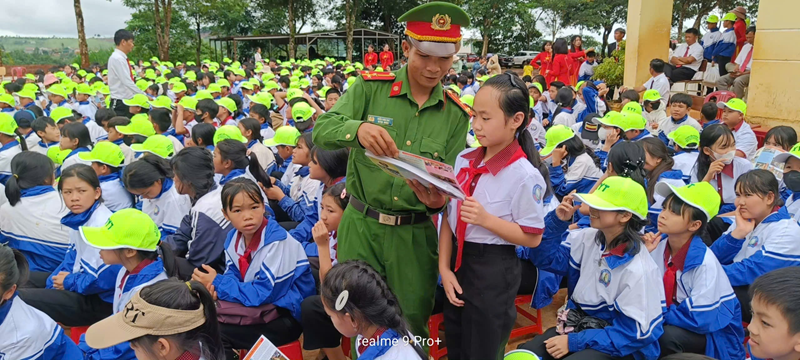Công an xã hướng dẫn chi tiết cho học sinh trong buổi tuyên truyền
