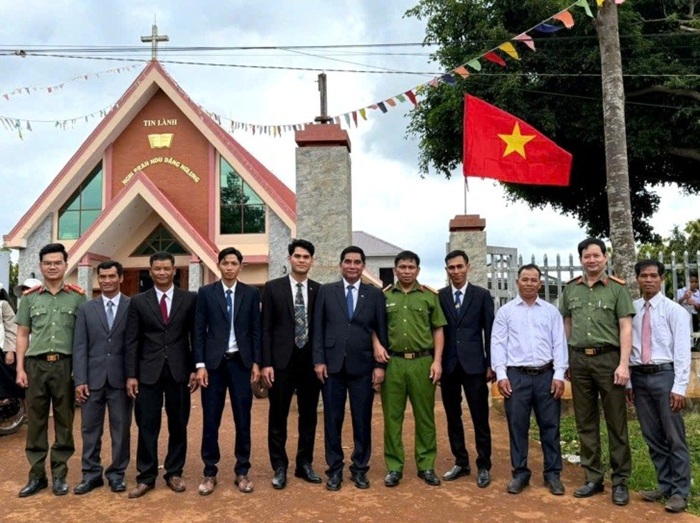 Đại diện chính quyền và Công an xã Đắk Sắk trao tặng cờ Tổ quốc cho Linh mục Giáo xứ Xuân Lộc