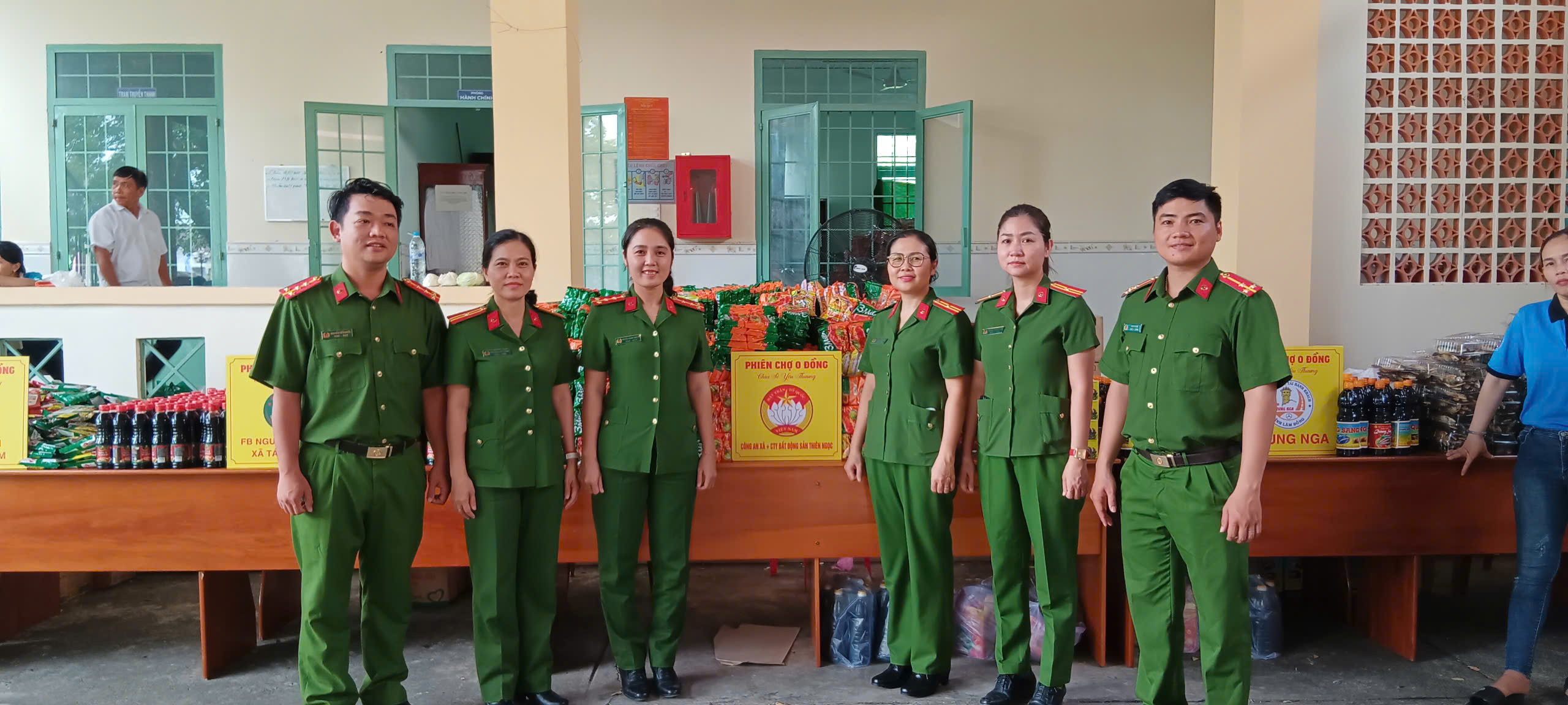 Lực lượng Công an xã Hàm Liêm hỗ trợ người dân tại Phiên chợ 0 đồng.