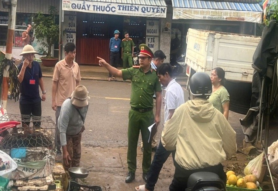 Cán bộ Công an xã tuyên truyền, nhắc nhở người dân tại chợ Kiến Đức và Nghĩa Thắng