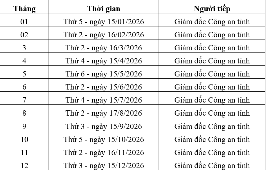 - Giám đốc Công an tỉnh thực hiện tiếp công dân định kỳ mỗi tháng 01 ngày, vào ngày 15 hằng tháng; nếu ngày 15 hằng tháng trùng với các ngày nghỉ lễ theo quy định thì tổ chức tiếp công dân vào ngày làm việc tiếp theo, cụ thể: