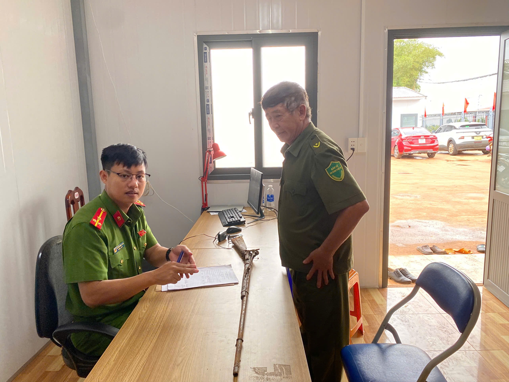 Lực lượng Bảo vệ ANTT cơ sở bàn giao Súng tự chế cho Công an xã sau khi vận động người dân giao nộp.