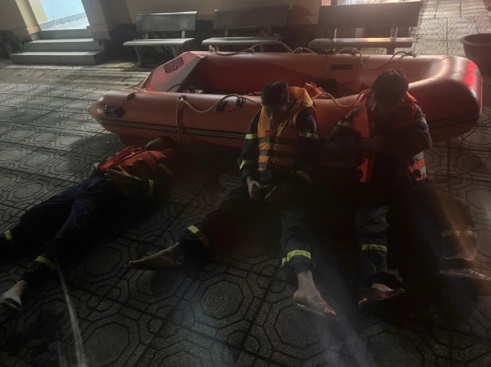 Các cán bộ chiến sĩ phòng Cảnh sát PCCC và CNCH tranh thủ nghỉ ngơi sau nhiều ngày liền hỗ trợ người dân vùng lũ