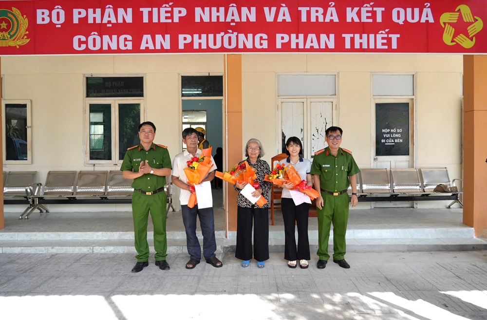 Công an phường Phan Thiết chào mừng những công dân đầu tiên thực hiện thủ tục hành chính trong ngày vận hành chính quyền hai cấp