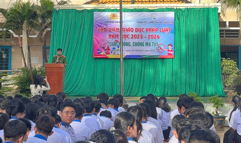 Tại xã Hàm Kiệm, sáng 29/9/2025, Công an xã phối hợp với Trường THPT Lương Thế Vinh tổ chức buổi tuyên truyền pháp luật về phòng, chống ma túy học đường. Buổi nói chuyện tập trung vào phân tích các loại ma túy phổ biến, thủ đoạn lôi kéo học sinh, hướng dẫn kỹ năng nhận biết và phòng tránh. Học sinh cũng được phổ biến quy định pháp luật, các hình thức xử lý hành vi vi phạm, qua đó nâng cao nhận thức, chủ động tự bảo vệ mình. Hoạt động thể hiện tinh thần chủ động, quyết tâm của lực lượng Công an xã trong công tác phòng ngừa tội phạm, xây dựng thế hệ trẻ khỏe mạnh, có ích cho xã hội.