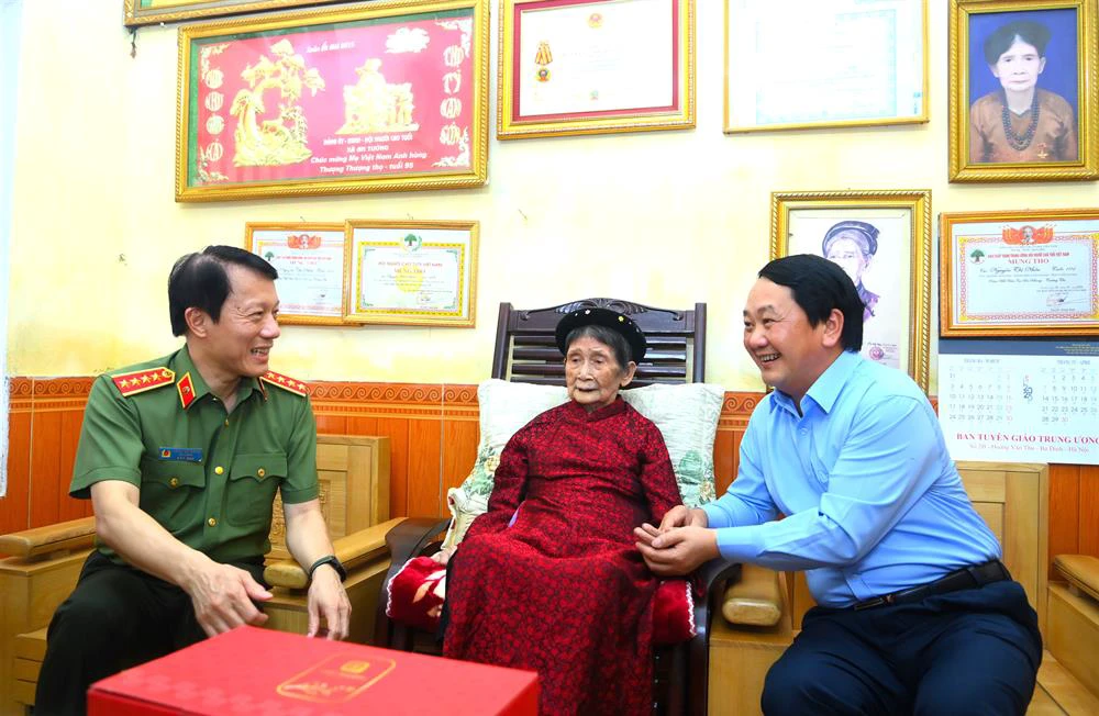 Bộ trưởng Lương Tam Quang; Bí thư Tỉnh ủy Hầu A Lềnh ân cần thăm hỏi sức khỏe và trao quà tặng Mẹ Việt Nam Anh hùng Nguyễn Thị Nhớn.