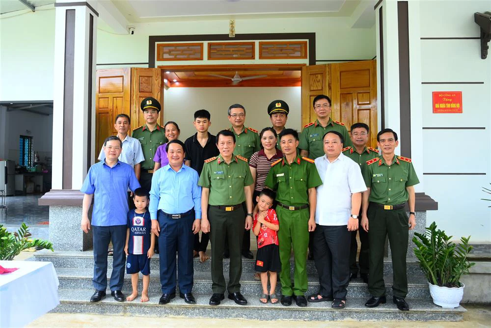 Bộ trưởng Lương Tam Quang cùng các đại biểu và gia đình Thiếu tá Nguyễn Quang Tường, cán bộ Công an xã Minh Thanh.