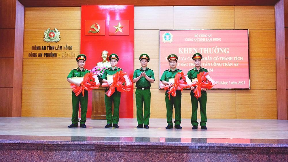 Đại tá Đậu Xuân Bảo, Phó Giám đốc Công an tỉnh Lâm Đồng trao giấy khen của Giám đốc Công an tỉnh cho tập thể, cá nhân có thành tích xuất sắc trong công tác đấu tranh phòng chống tội phạm