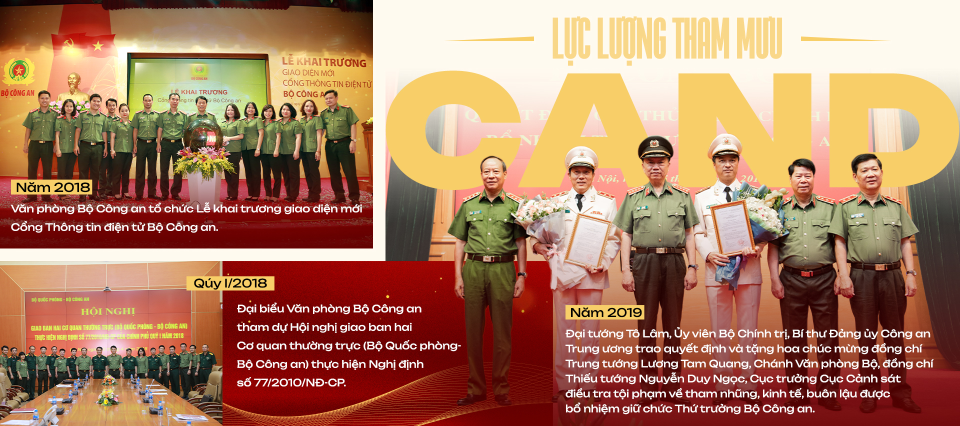 Đồng thời, lực lượng Tham mưu CAND đã tham mưu triển khai các mặt công tác điều phối bảo đảm tuyệt đối an ninh, an toàn nhiều sự kiện chính trị trọng đại như: Đại lễ 1000 năm Thăng Long - Hà Nội, Đại hội đồng liên minh Nghị viện thế giới lần thứ 132 (IPU-132), Tuần lễ cấp cao APEC 2017, Hội nghị thượng đỉnh Mỹ - Triều Tiên lần thứ 2; kỷ niệm 50 năm Ngày giải phóng miền Nam, thống nhất đất nước; kỷ niệm 80 năm Cách mạng tháng Tám thành công và Quốc khánh nước Cộng hòa xã hội chủ nghĩa Việt Nam; các kỳ Đại hội Đảng, bầu cử đại biểu Quốc hội và Hội đồng nhân dân các cấp. Đồng thời, thực hiện tốt nhiệm vụ tham mưu cho lãnh đạo các đơn vị và cấp ủy, chính quyền địa phương chỉ đạo toàn diện các mặt công tác bảo đảm an ninh, trật tự, tấn công, trấn áp tội phạm; tham mưu tổ chức, phục vụ chu đáo các Hội nghị Công an toàn quốc và nhiều hội nghị chuyên đề quan trọng khác; phục vụ hiệu quả công tác chỉ đạo, điều hành của Bộ Công an và Công an các địa phương.