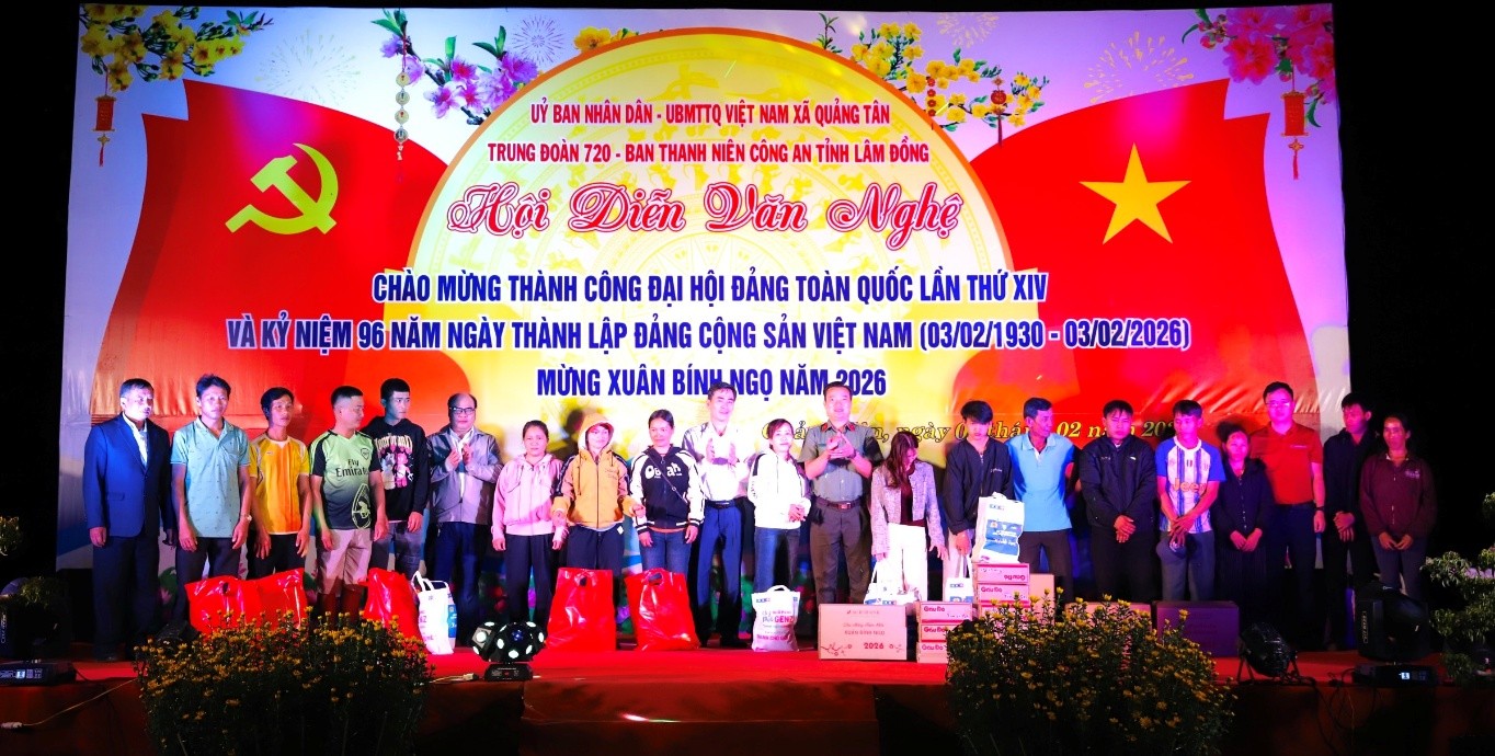 Chương trình được triển khai với nhiều hoạt động thiết thực, ý nghĩa, hướng về cơ sở, góp phần chăm lo đời sống Nhân dân trong dịp Tết nguyên đán Bính Ngọ 2026. Trong khuôn khổ chương trình, Ban Thanh niên Công an tỉnh đã phối hợp với chính quyền địa phương trao tặng 100 phần quà Tết cho các gia đình, trẻ em có hoàn cảnh khó khăn, tổ chức ra quân vệ sinh môi trường, tu sửa cảnh quan tại một số tuyến đường, khu dân cư trên địa bàn xã Quảng Tân... Bên cạnh công tác an sinh xã hội, lực lượng Công an còn đẩy mạnh tuyên truyền, phổ biến pháp luật, vận động Nhân dân chấp hành nghiêm các quy định về bảo đảm an ninh, trật tự, an toàn giao thông, phòng cháy, chữa cháy và phòng, chống các loại tội phạm… Đồng thời, tổ chức gặp mặt, thăm hỏi và giao lưu thể thao với cán bộ UBND xã Quảng Tân và cán bộ, chiến sĩ Binh đoàn 16 – Trung Đoàn 720.