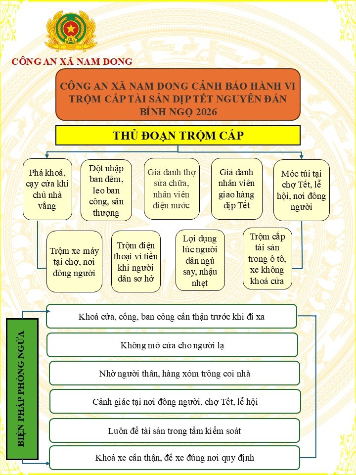 Hành vi trộm cắp tài sản không chỉ xâm phạm trực tiếp quyền sở hữu hợp pháp của công dân, tổ chức mà còn gây ảnh hưởng đến tình hình an ninh, trật tự, tạo tâm lý hoang mang, lo lắng trong Nhân dân. Vì vậy, Công an xã Nam Dong kêu gọi toàn thể cán bộ và Nhân dân nâng cao tinh thần cảnh giác, chủ động bảo vệ tài sản, tích cực phối hợp với lực lượng Công an trong công tác phòng ngừa, đấu tranh với tội phạm trộm cắp tài sản, góp phần giữ gìn cuộc sống bình yên cho mọi người, mọi nhà, nhất là trong dịp Tết Nguyên đán.