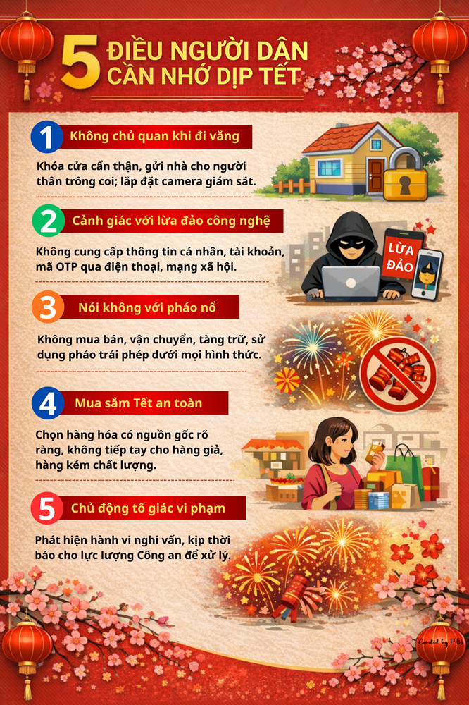 Thực tế cho thấy, nhiều vụ việc mất an ninh, trật tự trong dịp Tết bắt nguồn từ chính sự chủ quan của người dân. Việc nhà cửa không khóa kỹ khi đi vắng dài ngày; tài sản để sơ hở; thiếu cảnh giác trước các cuộc gọi, tin nhắn mạo danh cơ quan chức năng; hoặc vi phạm pháp luật do tâm lý hiếu kỳ, chạy theo không khí lễ Tết… có thể dẫn đến thiệt hại về tài sản, thậm chí kéo theo những hệ lụy pháp lý đáng tiếc.