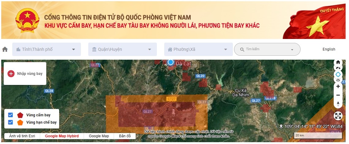 Tra cứu vùng cấm bay trên cổng thông tin điện tử Bộ Quốc phòng