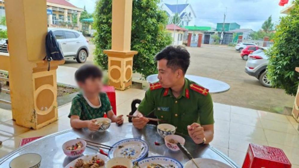 Công an xã Quảng Tín chăm sóc cháu bé sau khi đưa cháu về trụ sở