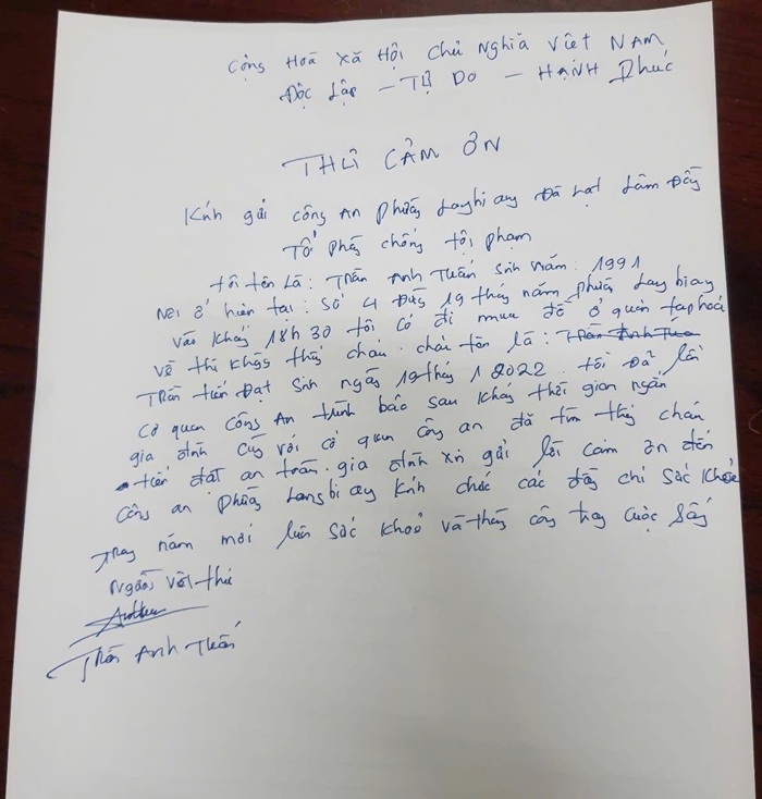Xúc động và biết ơn trước sự vào cuộc kịp thời, trách nhiệm của lực lượng Công an, anh Trần Anh Tuấn đã viết thư cảm ơn gửi đến Công an phường Lang Biang – Đà Lạt. Trong thư, anh bày tỏ sự trân trọng và lòng biết ơn sâu sắc đối với tinh thần vì nhân dân phục vụ của lực lượng Công an.