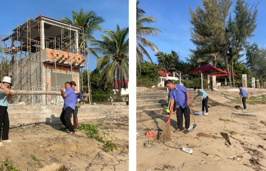 Không dừng lại ở công tác cứu trợ, hỗ trợ Nhân dân, sau khi hoàn thành nhiệm vụ, toàn thể cán bộ, chiến sĩ và nhân viên Nhà nghỉ dưỡng Mũi Né đã khẩn trương trở về đơn vị để tập trung khắc phục hậu quả bão lũ. Trước lượng rác thải lớn từ biển tràn vào, cây xanh gãy đổ, khuôn viên bị ảnh hưởng nghiêm trọng, các lực lượng đã không quản ngại nắng gió, chung tay dọn dẹp vệ sinh, thu gom rác thải, dựng lại cây xanh, làm sạch bãi biển, nhanh chóng khôi phục cảnh quan môi trường.