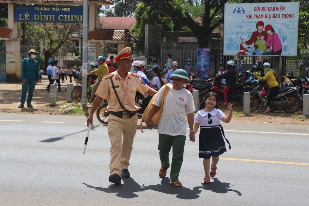 Hình ảnh đẹp về cán bộ Cảnh sát giao thông Công an Lâm Đồng đưa người dân qua đường