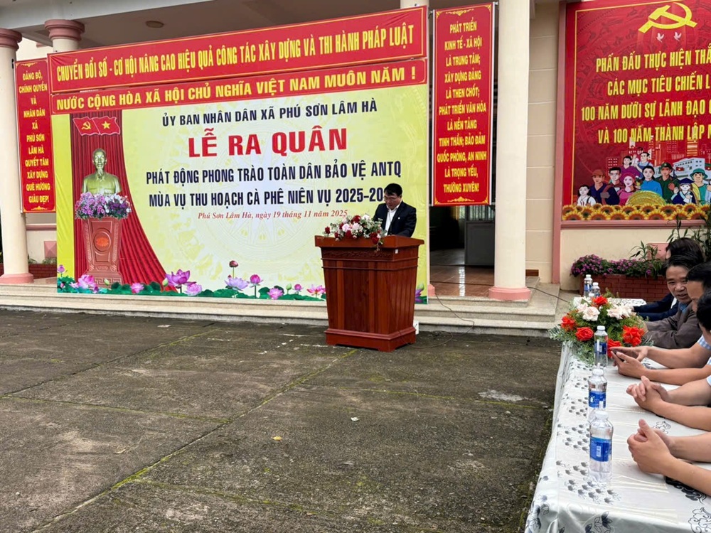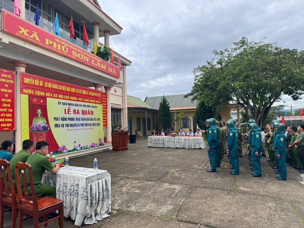 Tại buổi lễ, Công an xã Phú Sơn Lâm Hà đã triển khai kế hoạch bảo đảm an ninh, trật tự trong thời gian thu hoạch cà phê; tập trung vào các nội dung trọng tâm: tăng cường tuần tra trên các tuyến đường, khu vực tập kết nông sản; đẩy mạnh tuyên truyền phòng ngừa tội phạm; nhân rộng các mô hình tự quản về ANTT; tổ chức ký cam kết giữa hộ gia đình, chủ thu mua, chủ xưởng sấy với lực lượng chức năng về bảo đảm an ninh nông thôn.