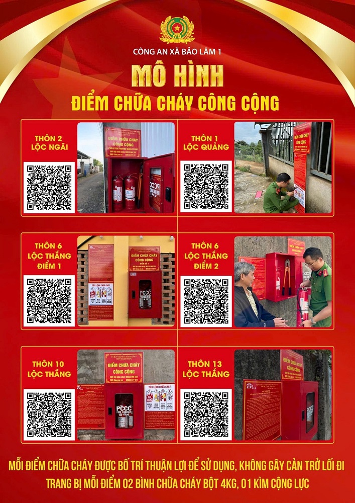 Mỗi điểm chữa cháy công cộng được trang bị đầy đủ phương tiện phục vụ chữa cháy ban đầu, gồm: 02 bình chữa cháy bột loại 4kg, 01 kìm cộng lực, bảng hướng dẫn sử dụng bình chữa cháy, nội quy quản lý và sử dụng phương tiện tại điểm chữa cháy, số điện thoại báo cháy. Lực lượng Công an xã thường xuyên kiểm tra tình trạng hoạt động của các phương tiện, kịp thời bổ sung, thay thế khi cần thiết; đồng thời trực tiếp tuyên truyền, hướng dẫn người dân kỹ năng sử dụng bình chữa cháy và cách xử lý tình huống cháy, nổ ngay từ giai đoạn ban đầu.