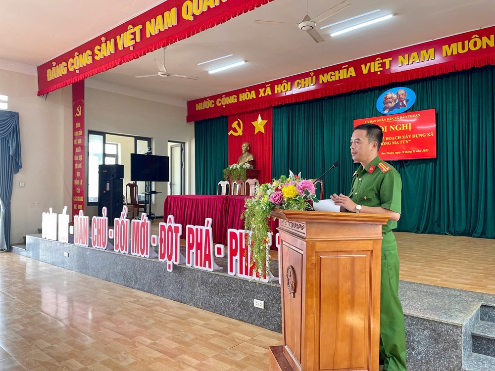 Đồng chí Trung tá Nguyễn Chí Thanh – Trưởng Công an xã phát biểu triển khai nhiệm vụ tại Hội nghị xây dựng xã Bảo Thuận “không ma túy”