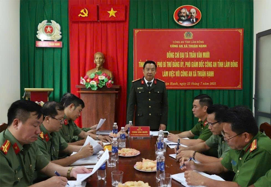 Đồng chí Đại tá Trần Văn Mười – Tỉnh uỷ viên, Phó Bí thư Đảng uỷ, Phó Giám đốc Công an tỉnh trong buổi làm việc tại Công an xã Thuận Hạnh