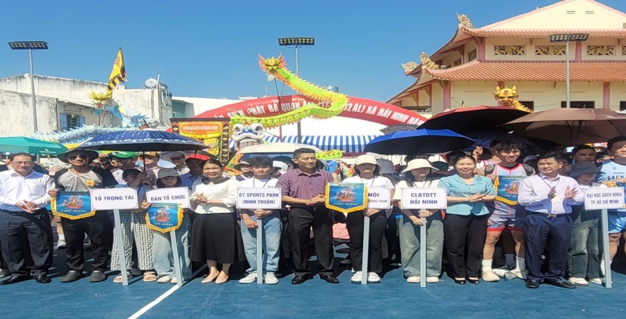 Đồng chí Hồ Ngọc Long, Phó Trưởng Phòng An ninh đối ngoại tặng cờ lưu niệm các đội bóng rổ tham dự giải Lễ vía Phật Bà Quan Âm