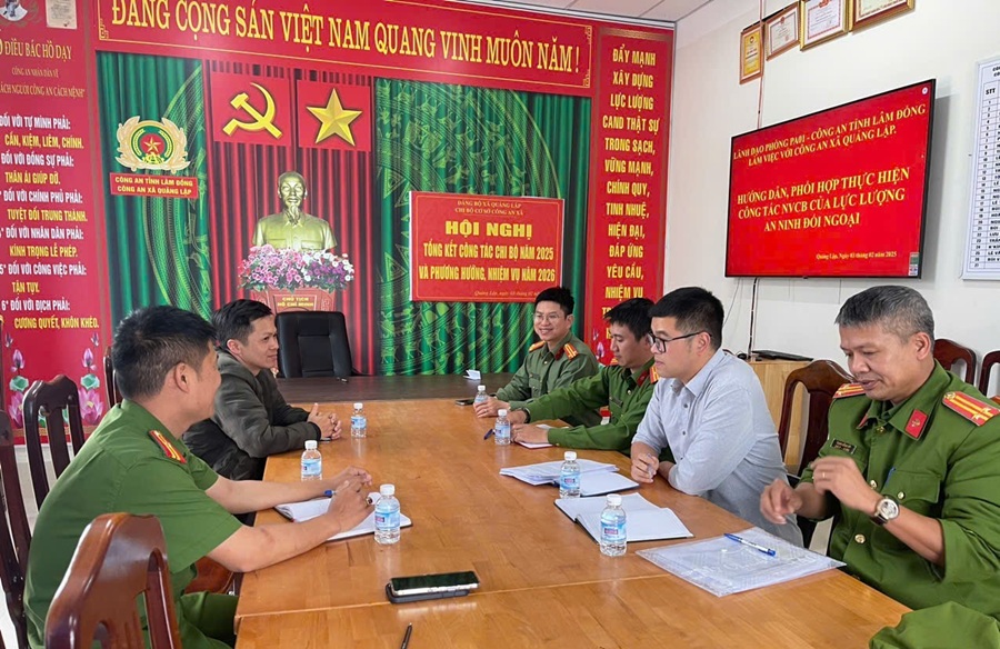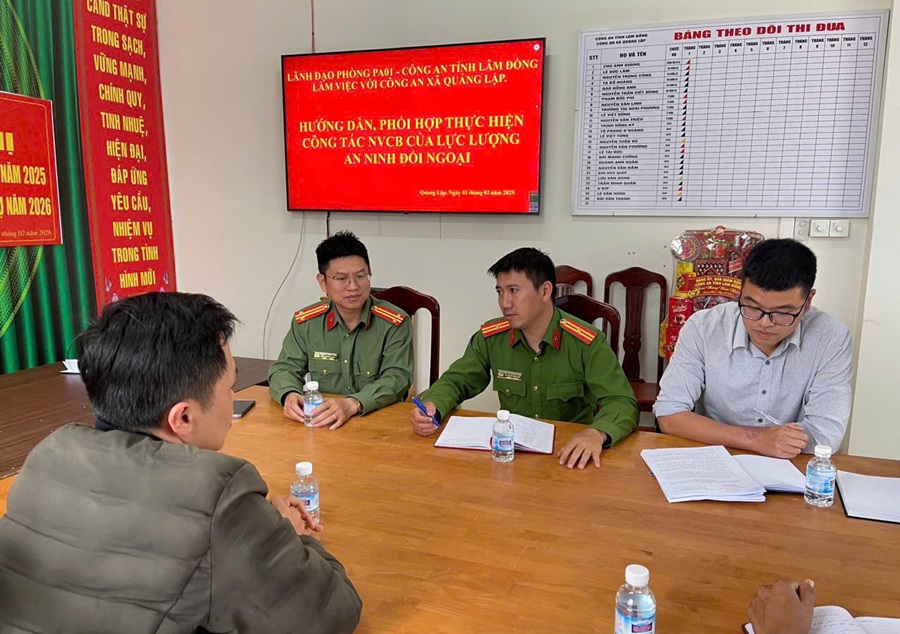 Thực hiện kế hoạch của Công an tỉnh Lâm Đồng về mở đợt cao điểm tấn công, trấn áp tội phạm phục vụ Đại hội đại biểu toàn quốc lần thứ XIV của Đảng, bầu cử đại biểu Quốc hội khóa XVI, Hội đồng nhân dân các cấp nhiệm kỳ 2026 – 2031 và Tết Nguyên đán Bính Ngọ 2026, Phòng An ninh đối ngoại đã thành lập tổ công tác do Trung tá Nguyễn Trần Tuấn - Phó Trưởng phòng làm Tổ trưởng đến làm việc với Công an xã Quảng Lập và Công an xã D’Ran. Tại buổi làm việc, Công an các xã đã báo cáo tình hình, kết quả triển khai công tác bảo đảm an ninh, trật tự trong lĩnh vực đối ngoại; nêu rõ những khó khăn, vướng mắc trong quá trình thực hiện nhiệm vụ. Trên cơ sở đó, tổ công tác trực tiếp trao đổi, hướng dẫn xử lý các vấn đề phát sinh thuộc thẩm quyền, đồng thời định hướng những nhiệm vụ trọng tâm cần tập trung thực hiện trong dịp Tết và lễ hội đầu Xuân, nhất là công tác nắm tình hình, quản lý người nước ngoài và các hoạt động có yếu tố đối ngoại tại địa bàn cơ sở.