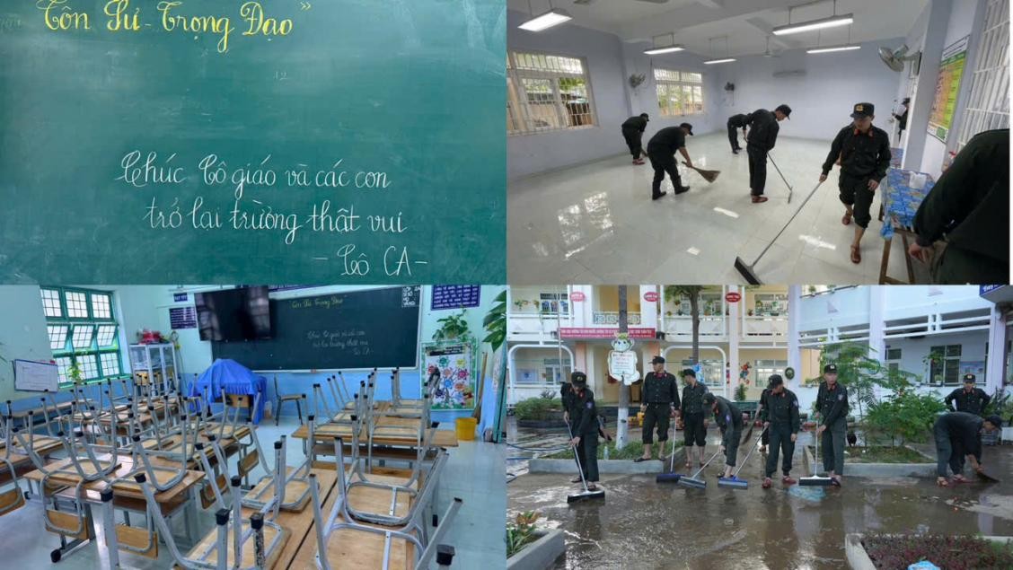 CBCS Cảnh sát cơ động dọn dẹp vệ sinh trường học tại xã Hàm Thắng và hỗ trợ bà con về nơi ở sau khi nước rút