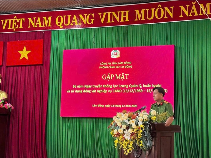Ngày 13/12/2025, Phòng Cảnh sát cơ động Công an tỉnh Lâm Đồng tổ chức gặp mặt kỷ niệm 66 năm Ngày truyền thống lực lượng quản lý, huấn luyện và sử dụng động vật nghiệp vụ (15/12/1959 – 15/12/2025). Tham dự buổi gặp mặt có các đồng chí nguyên là cán bộ từng công tác trong lực lượng qua các thời kỳ, lãnh đạo đơn vị cùng toàn thể cán bộ, chiến sĩ Phòng Cảnh sát cơ động.