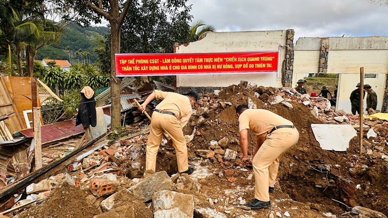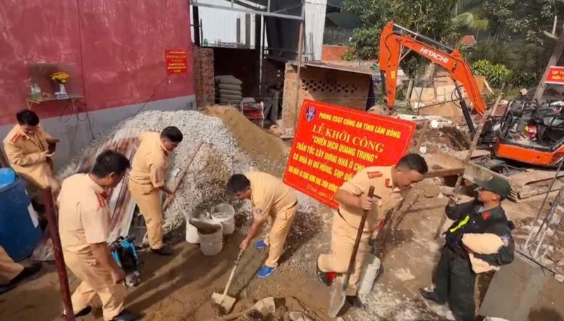 Cán bộ, chiến sĩ Phòng Cảnh sát giao thông khởi công xây dựng nhà cho gia đình bà Đỗ Thị Bích Phượng ở thôn Đường Mới, xã D’Ran, tỉnh Lâm Đồng bị sập hoàn toàn do thiên tai.