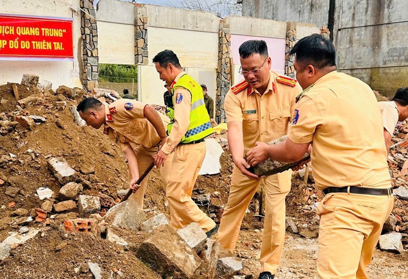 Cán bộ, chiến sĩ Phòng Cảnh sát giao thông hỗ trợ ngày công giúp người dân xây dựng nhà ở sau thiên tai.