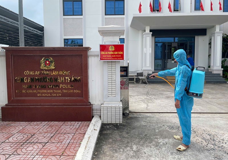 Bệnh xá số 2 thực hiện phun thuốc diệt côn trùng, khử khuẩn tại các trụ sở làm việc thuộc Công an phường Hàm Thắng