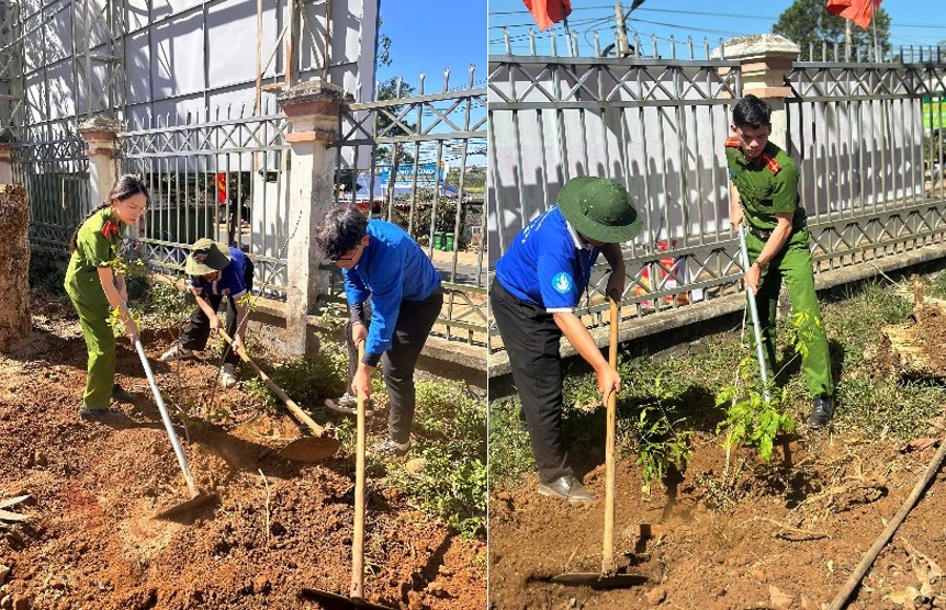Cán bộ, chiến sĩ Phòng Kỹ thuật hình sự trồng cây xanh tại khu vực trung tâm hành chính xã Phúc Thọ Lâm Hà