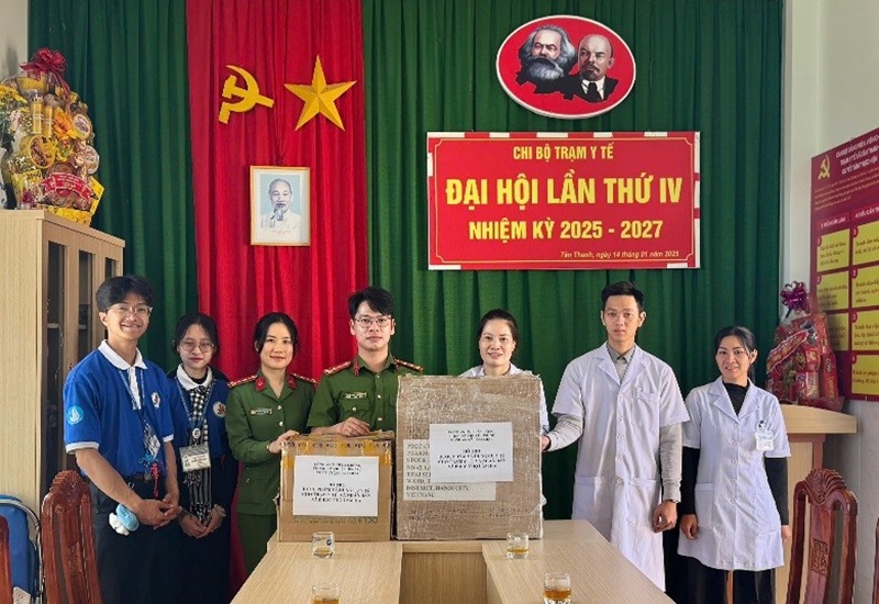 Cán bộ, chiến sĩ Phòng Kỹ thuật hình sự thăm, tặng dược phẩm và dụng cụ y tế cho Trạm y tế xã Phúc Thọ Lâm Hà