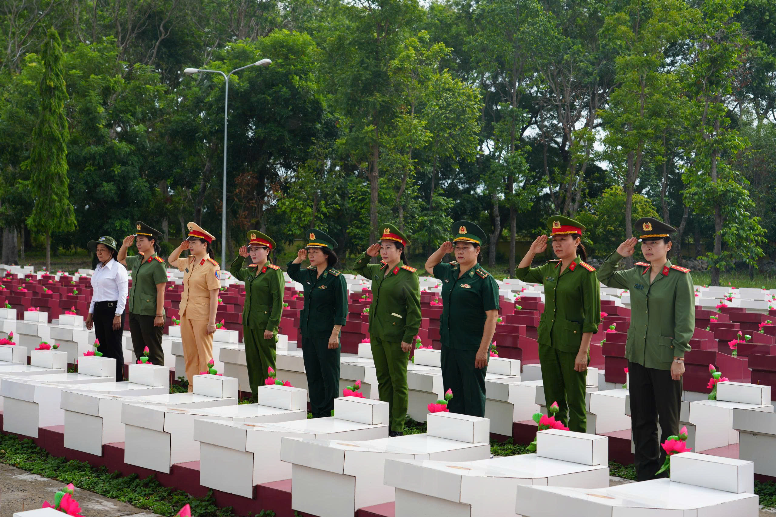 Ban Phụ nữ Công an tỉnh đã phối hợp cùng Phụ nữ lực lượng Biên phòng tỉnh chăm sóc các phần mộ liệt sỹ chưa biết tên tại Nghĩa trang liệt sỹ, xã Hồng Sơn, tỉnh Lâm Đồng.