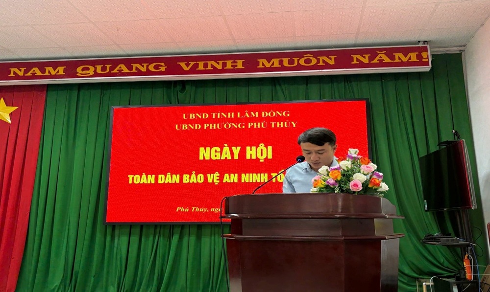 Đồng chí Trần Minh Nhiên – Phó Trưởng Công an phường đọc diễn văn phong trào toàn dân bảo vệ an ninh Tổ quốc