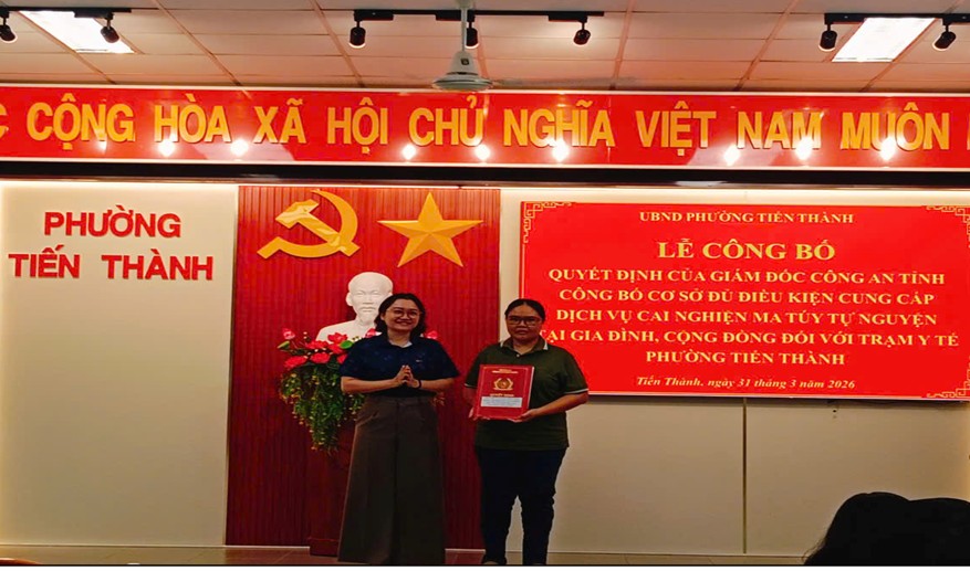 Tại buổi lễ, đại diện UBND phường Tiến Thành đã trao Quyết định của Giám đốc Công an tỉnh công nhận Trạm Y tế phường Tiến Thành là cơ sở đủ điều kiện cung cấp dịch vụ cai nghiện ma túy tự nguyện tại gia đình và cộng đồng.