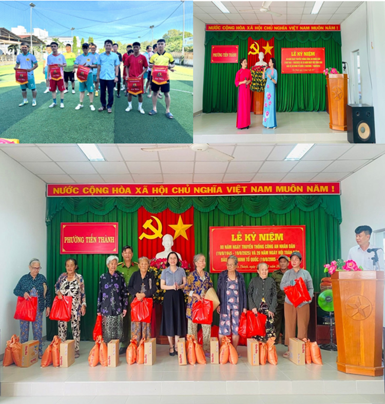 Tại buổi lễ, các đại biểu và đông đảo Nhân dân đã cùng nhau ôn lại truyền thống vẻ vang của lực lượng CAND, trao đổi kinh nghiệm trong xây dựng phong trào Toàn dân bảo vệ ANTQ; đồng thời tham gia các hoạt động giao lưu văn nghệ, thể thao. Dịp này, Công an phường Tiến Thành đã trao tặng 20 suất quà cho các hộ gia đình có hoàn cảnh đặc biệt khó khăn.